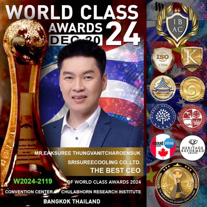 คุณเอกสุรีย์ ตั้งเวนิชเจริญสุข ผู้บริหารสูงสุด บริษัท ศรีสุรีย์คูลลิ่ง จํากัด คว้ารางวัล WORLD CLASS AWARDS 2024 ในสาขา The Best CEO