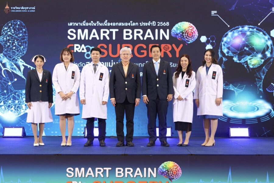 “เนื้องอกในสมอง” เกิดจากการเจริญเติบโตผิดปกติของเซลล์ภายในสมอง การเจริญเติบโตเหล่านี้อาจเป็นมะเร็งหรือไม่ใช่มะเร็งก็ได้ แต่ไม่ว่าจะเป็นเนื้องอกชนิดใด ก็สามารถทำให้เกิดอาการทางระบบประสาทได้หลากหลายโดยหากมีรอยโรคบริเวณนี้แล้ว อาจทำให้เกิดความเสียหายที่รุนแรง เช่น พิการหรืออาจเสียชีวิต หากไม่ได้รับการรักษาที่ถูกต้องและทันเวลา ทั้งนี้ เพื่อสร้างความตระหนักและให้ความรู้เกี่ยวกับเนื้องอกในสมอง โดยศูนย์ศัลยกรรม โรงพยาบาลจุฬาภรณ์ ราชวิทยาลัยจุฬาภรณ์ จึงได้จัดกิจกรรมบริการสุขภาพด้านกลุ่มโรคสมองและระบบประสาท และบริการทางการแพทย์นวัตกรรมการผ่าตัดเนื้องอกในสมอง เนื่องในวันเนื้องอกในสมองโลก (World Brain Tumor Day) 2568 ภายใต้แนวคิด SMART BRAIN SURGERY “ผ่าตัดสมองแม่นยำด้วยเทคโนโลยีอัจฉริยะ” โดยมี รศ.นพ.สุรศักดิ์ ลีลาอุดมลิปิ รักษาการผู้อำนวยการโรงพยาบาลจุฬาภรณ์ กล่าวเปิดงาน พร้อมด้วยทีมศัลยแพทย์และอายุรแพทย์เฉพาะทางโรคสมองและระบบประสาท และวิสัญญีแพทย์โรงพยาบาลจุฬาภรณ์ นำโดย ผศ.ป.นพ.ปโยธร เดชะรินทร์ รักษาการหัวหน้างานศัลยกรรมทั่วไป แพทย์เฉพาะทางด้านศัลยกรรมระบบประสาทและรังสีร่วมรักษาระบบประสาท นพ.พงศกร พงศาพาส แพทย์เฉพาะทางด้านศัลยกรรมระบบประสาท พญ.อาทิตา ชูหลำ แพทย์เฉพาะทางด้านอายุรกรรมประสาทวิทยา พญ.นิศารัตน์ อาชวาคม วิสัญญีแพทย์เฉพาะทางสำหรับผู้ป่วยโรคทางระบบประสาท และคุณณัฏพล บุญเรือง พยาบาลวิชาชีพเฉพาะทางสาขาการพยาบาลผู้ป่วยโรคหลอดเลือดสมอง หอผู้ป่วยวิกฤตรวม โรงพยาบาลจุฬาภรณ์ เข้าร่วมงาน ณ ห้องประชุม Convention Hall ชั้น 6 อาคารกรมพระศรีสวางควัฒน โรงพยาบาลจุฬาภรณ์ โดยมีหมอก้อง สรวิชญ์ สุบุญ เป็นผู้ดำเนินรายการ วันศุกร์ที่ 6 มิถุนายน 2568