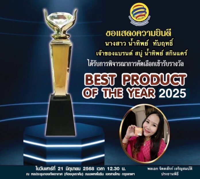 และหนึ่งในบุคคล องค์กร และแบรนด์ผลิตภัณฑ์ ที่ผ่านเกณฑ์การคัดเลือก และพิจารณาจากเหล่าคณะกรรมการผู้ทรงคุณวุฒิ ให้เข้ารับรางวัล Best Product Of The Year 2025 คือผลิตภัณฑ์สบู่แครอท ออร่า ไวท์เทนนิ่ง แครอท โซป แบรนด์ น้ำทิพย์ สกินแคร์ ภายใต้การบริหารงานโดย คุณน้ำทิพย์ ทับฤทธิ์