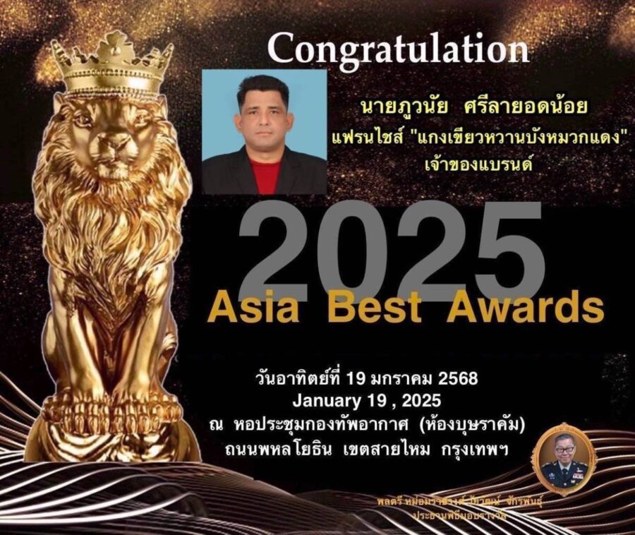 ถือเป็นการตอกย้ำความสำเร็จ ของการดำเนินธุรกิจได้อย่างน่าภูมิใจ หลังธุรกิจแฟรนไชส์ “แกงเขียวหวานบังหมวกแดง” ได้ผ่านการรับรองเครื่องหมาย อย. และสัญลักษณ์ ฮาลาล โดยล่าสุด ทางแฟรนไชส์ ยังได้รับการคัดเลือก และพิจารณาจากเหล่าคณะกรรมการผู้ทรงคุณวุฒิ ให้เข้ารับรางวัลใหญ่แห่งปี Asia Best Awards 2025 ไปเมื่อวันที่ 19 ม.ค. ที่ผ่านมา โดยมี พลตรี หม่อมราชวงศ์ วัยวัฒน์ จักรพันธุ์ เป็นประธานในพิธี ณ หอประชุมกองทัพอากาศ (ห้องบุษราคัม) ถนนพหลโยธิน เขตสายไหม กรุงเทพฯ