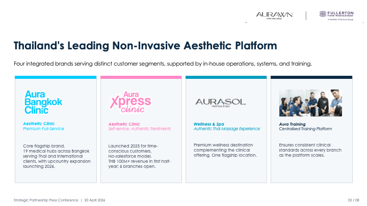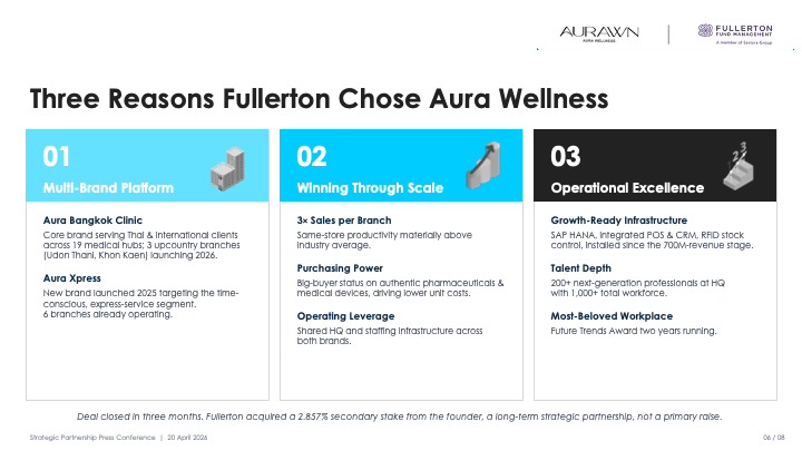 ทั้งนี้ การเชื่อมโยงความร่วมมือในครั้งนี้เกิดขึ้นโดยการสนับสนุนของคุณ Albert Wu จาก 10Bridge ซึ่งเป็น Local Partner ของ Fullerton Thai Private Equity และเป็นผู้มีบทบาทสำคัญในการประสานความร่วมมือระหว่างกองทุน Fullerton กับบริษัท Aura Wellness โดยเป้าหมายของเราคือการผลักดันให้ประเทศไทยเป็น Wellness Destination ของโลกอย่างแท้จริง ด้วยระบบบริหารจัดการที่โปร่งใส และได้มาตรฐานสากลที่เราวางรากฐานไว้ ซึ่งทำให้เราพร้อมรองรับการขยายตัวอย่างเป็นระบบในอนาคต”