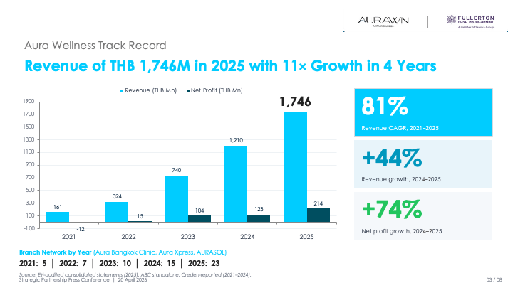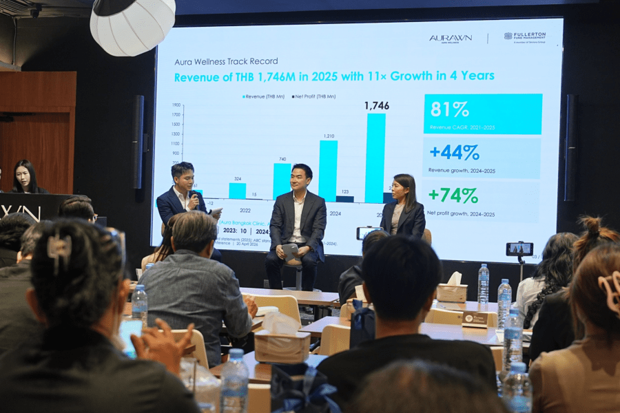 ในปีที่ผ่านมา Aura Wellness ทำรายได้รวมสูงถึง 1,746 ล้านบาท เติบโตขึ้น 81% มีกำไรสุทธิ 214 ล้านบาท เพิ่มขึ้น 74% เมื่อเทียบกับปี 2024 โดยมีจุดแข็งสำคัญอยู่ที่ยอดขายต่อสาขาของ Aura Bangkok Clinic ที่สูงกว่าค่าเฉลี่ยตลาดถึง 3 เท่า รวมถึงความสำเร็จของแบรนด์น้องใหม่อย่าง Aura Xpress ที่ทำรายได้ทะลุ 100 ล้านบาทได้ภายในเวลาเพียงครึ่งปี ความสำเร็จดังกล่าว ส่งผลให้ Fullerton Fund Management หนึ่งในกองทุนที่น่าเชื่อถือที่สุดของสิงคโปร์ ตัดสินใจเข้าลงทุนในรูปแบบรายการหุ้น โดย Aura Wellness เป็นบริษัทไทยเพียงรายเดียวในกลุ่ม Wellness ที่ได้รับการคัดเลือก สะท้อนให้เห็นว่าธุรกิจ Aesthetic Medical ของไทยมีศักยภาพสูงในสายตานักลงทุนต่างชาติ สอดคล้องกับเทรนด์ Medical Tourism ของไทยที่มีอัตราการเติบโตเฉลี่ย 10.49% ต่อปี