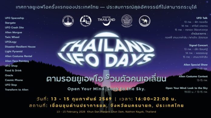 การท่องเที่ยวแห่งประเทศไทย (ททท.) ขอเชิญชวนทุกท่านร่วมเปิดประสบการณ์ท่องเที่ยวรูปแบบใหม่ งานเดียวที่จะชวนคุณเปิดใจ แล้วมองขึ้นไปบนท้องฟ้า รวมพลคนชอบ คนเชื่อ คนอยากรู้ในงาน “Thailand UFO Days ตามรอยยูเอฟโอ รวมตัวคนเอเลี่ยน” ระหว่างวันที่ 13–15 กุมภาพันธ์ 2569 เวลา 16.00–22.00 น. ณ เขื่อนขุนด่านปราการชล จังหวัดนครนายก